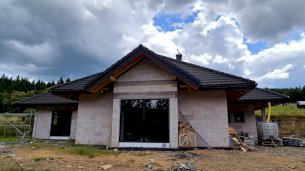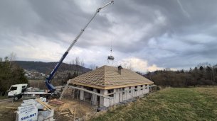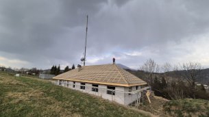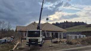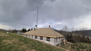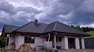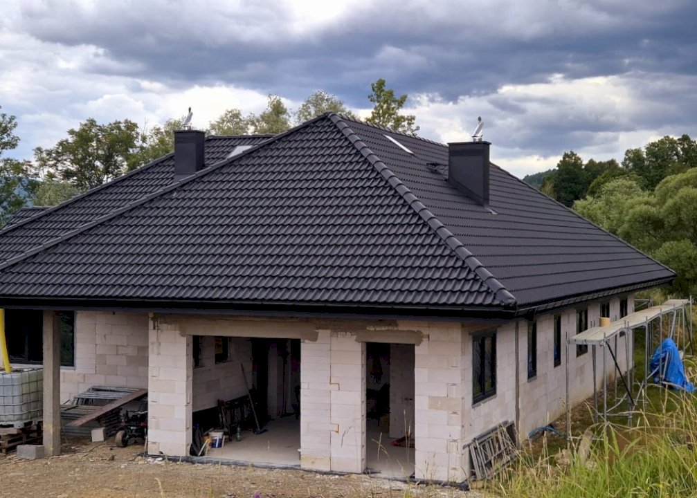 Kompleksowe wykonanie dachu - montaż konstrukcji- montaż membrany- łacenie- montaż pokrycia - zastosowana dachówka falista firmy Creaton - montaż elementów dachowych- obróbka blacharska komina
